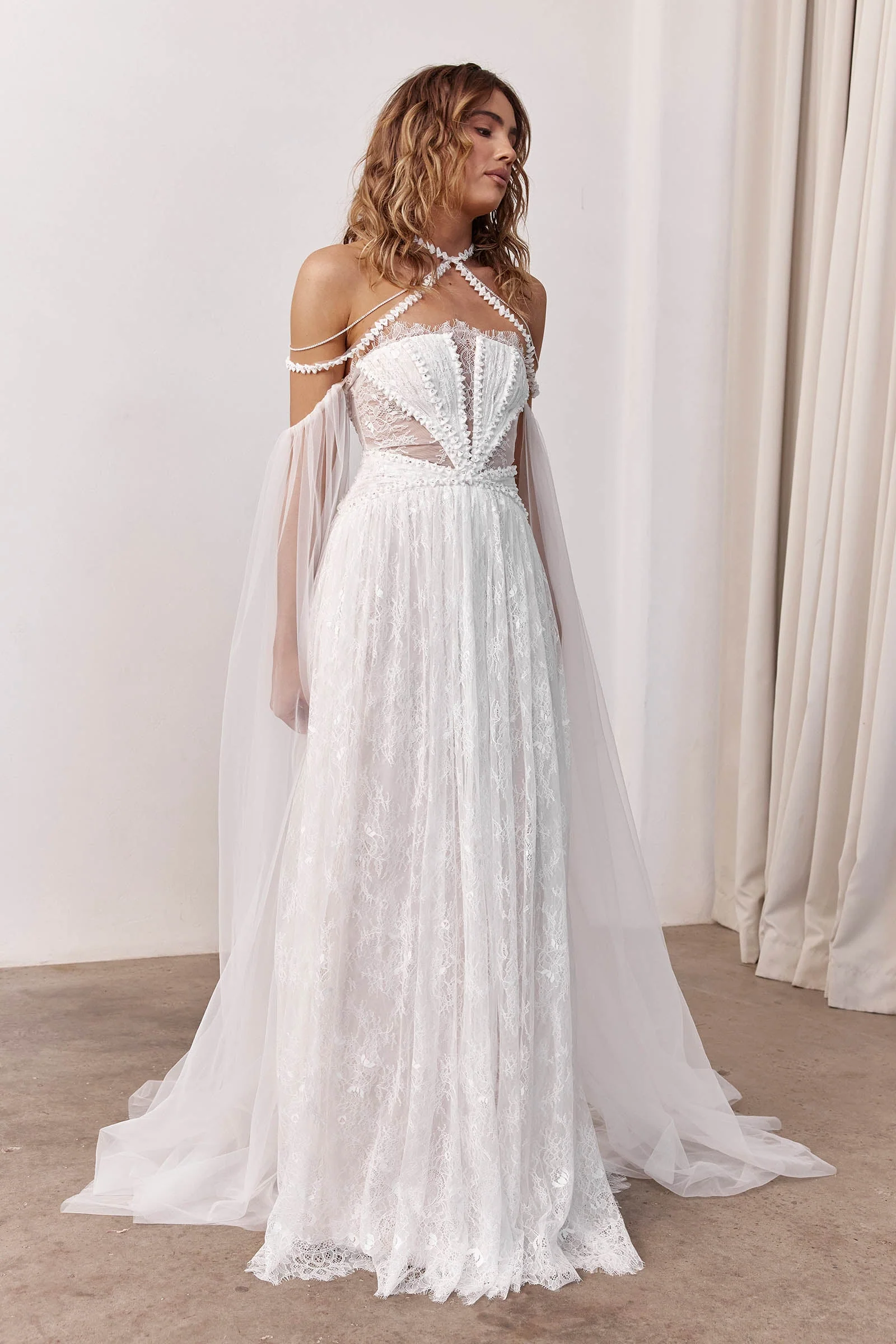 A gown that's anything but ordinary. Brunella is a boho wedding dress that feels both delicate and detailed, designed from our signature lace and trim combination for a true Grace finish. She reimagines traditional techniques with flexi-boning and sheer elements for built-in support.