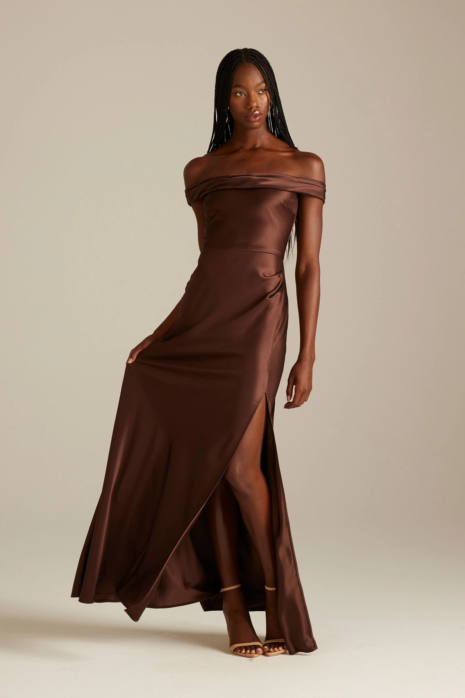 Spotlighting Kai, for understated evenings. Crafted from a luxurious eco-satin our espresso brown bridesmaid dresses, offer head-to-toe refinement.
