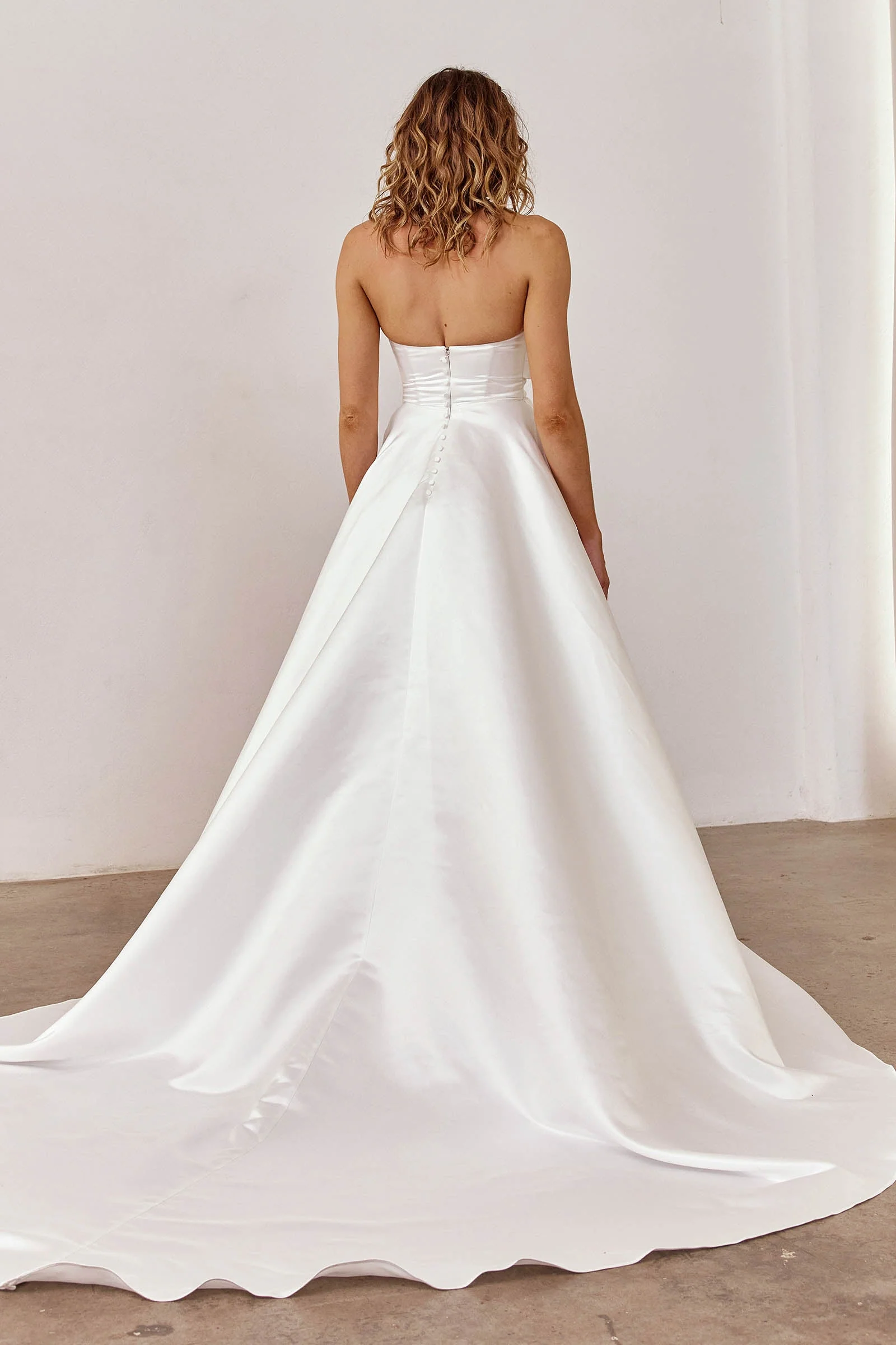 Crafted from structured satin, the strapless silhouette features internal flexi-boning to cinch the waist and a curved neckline that feels both modern and romantic. Pip has a magnetic presence, the kind of gown that does nothing and still takes over the entire room.